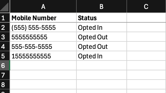 The file you are uploading must be in CSV format and have two required columns mapped: Mobile Number and Status. The accepted values for Status are "Opted In" and "Opted Out", anything else will result in an error upon import.